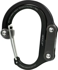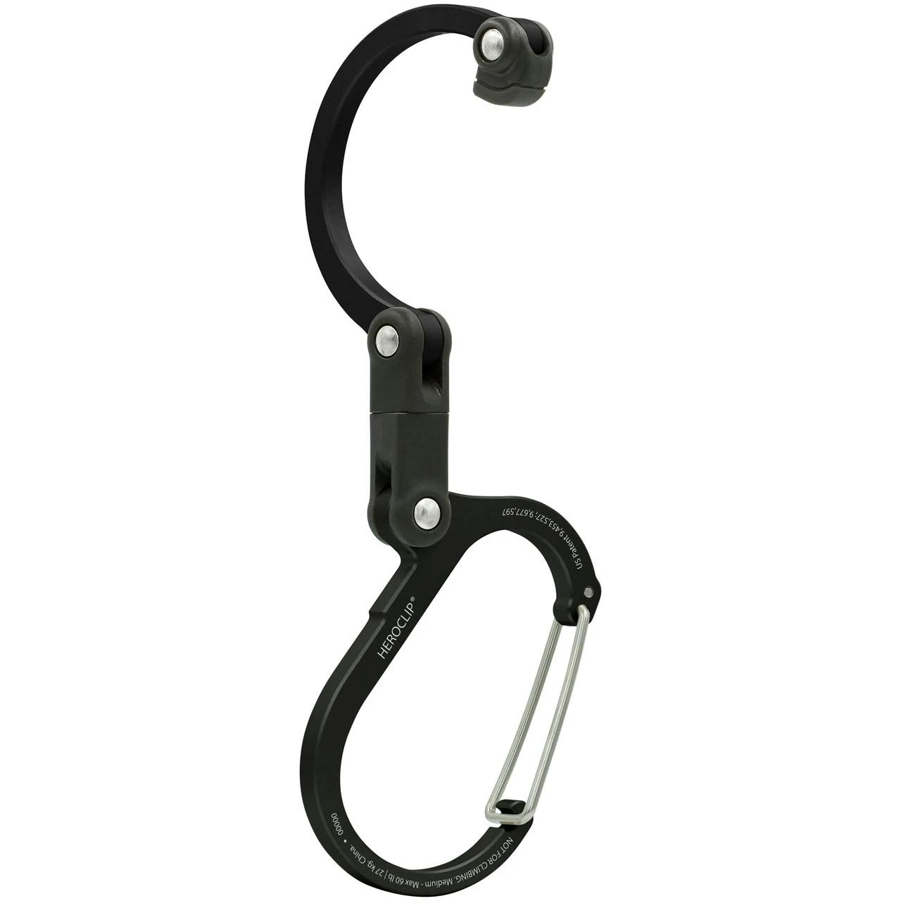Keep your gear off the ground, your bag off the floor of the bus, organize your gear closet, the uses for this little carabiner crossed with a gear hook are endless. The Heroclip takes the versatile carabiner and adds a swivelling hook with a grippy Rubber tip. This combo lets you clip your gear to the carabiner and then swivel the hook into place, the grippy rubber keeps the hook from sliding about and protects whatever you are hanging your stuff from.