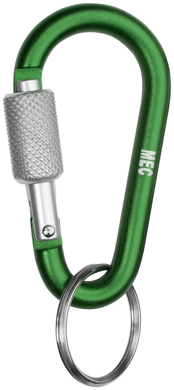 A small aluminum accessory carabiner with the added security of a slide lock and a key ring attached.