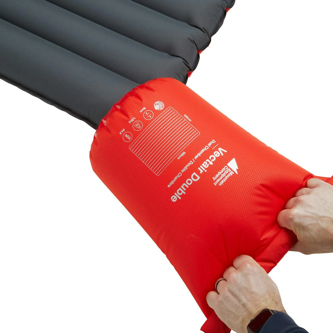 From MEC, an insulated double sleeping pad that performs superbly, at a price point we’re totally proud to offer. Using warm synthetic insulation, we opted for offset baffles – each one overlaps the next – so cold spots don’t develop while you sleep, and we welded the insulation to the ends and bottom of the pad to prevent it from shifting. Inflation is a breeze, thanks to the included pump sack.